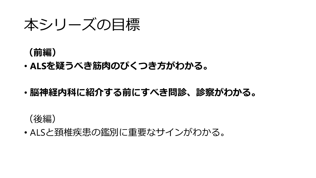 #3. 本シリーズの目標 (前編) • ALSを疑うべき筋肉のぴくつき方がわかる。 • 脳神経内科に紹介する前にすべき問診、診察がわかる。 (後編) • ALSと頚椎疾患の鑑別に重要なサインがわかる。