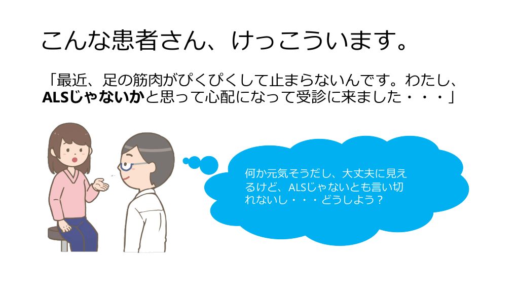 #4. こんな患者さん、けっこういます。 「最近、足の筋肉がぴくぴくして止まらないんです。わたし、 ALSじゃないかと思って心配になって受診に来ました・・・」 何か元気そうだし、大丈夫に見え るけど、ALSじゃないとも言い切 れないし・・・どうしよう?