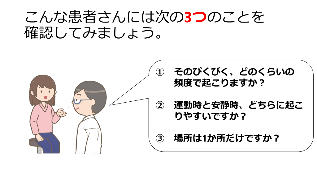 #5. こんな患者さんには次の3つのことを 確認してみましょう。 ① そのぴくぴく、どのくらいの 頻度で起こりますか? ② 運動時と安静時、どちらに起こ りやすいですか? ③ 場所は1か所だけですか?
