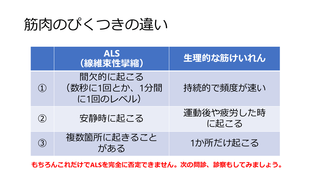 #6. 筋肉のぴくつきの違い ① ALS (線維束性攣縮) 間欠的に起こる (数秒に1回とか、1分間 に1回のレベル) 生理的な筋けいれん 持続的で頻度が速い ② 安静時に起こる 運動後や疲労した時 に起こる ③ 複数箇所に起きること がある 1か所だけ起こる もちろんこれだけでALSを完全に否定できません。次の問診、診察もしてみましょう。