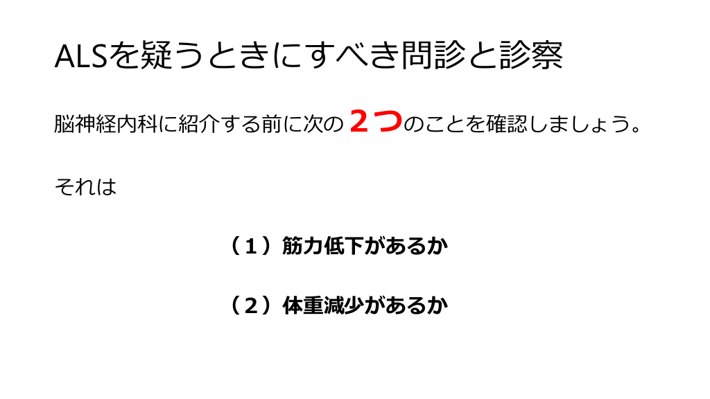 #7. ALSを疑うときにすべき問診と診察 脳神経内科に紹介する前に次の2つのことを確認しましょう。 それは (1)筋力低下があるか (2)体重減少があるか