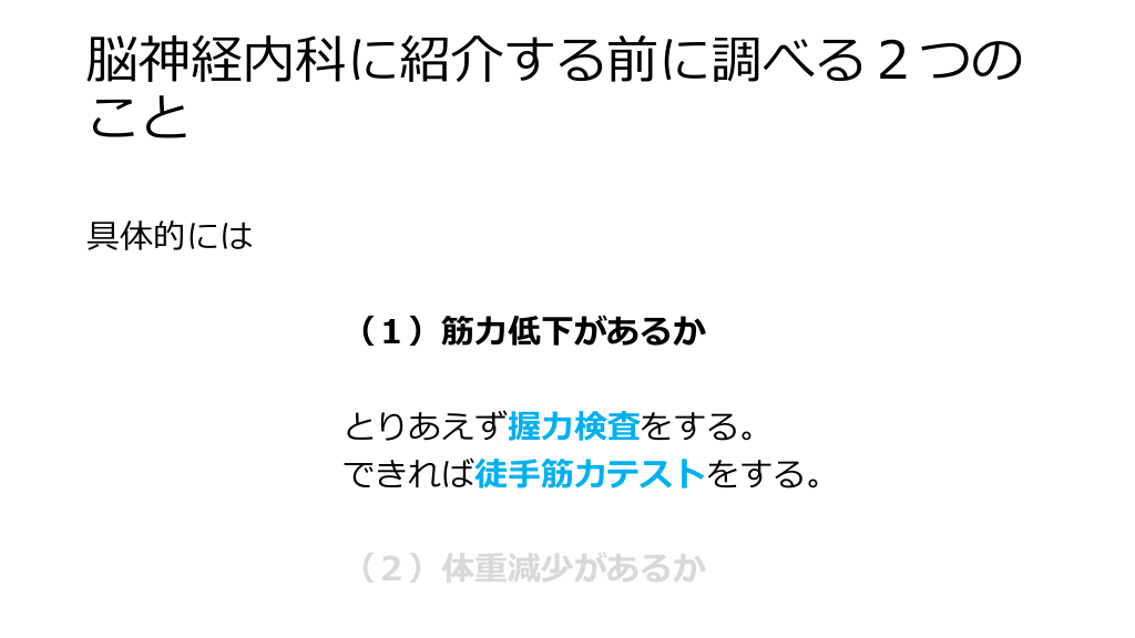 #8. 脳神経内科に紹介する前に調べる2つの こと 具体的には (1)筋力低下があるか とりあえず握力検査をする。 できれば徒手筋力テストをする。 (2)体重減少があるか