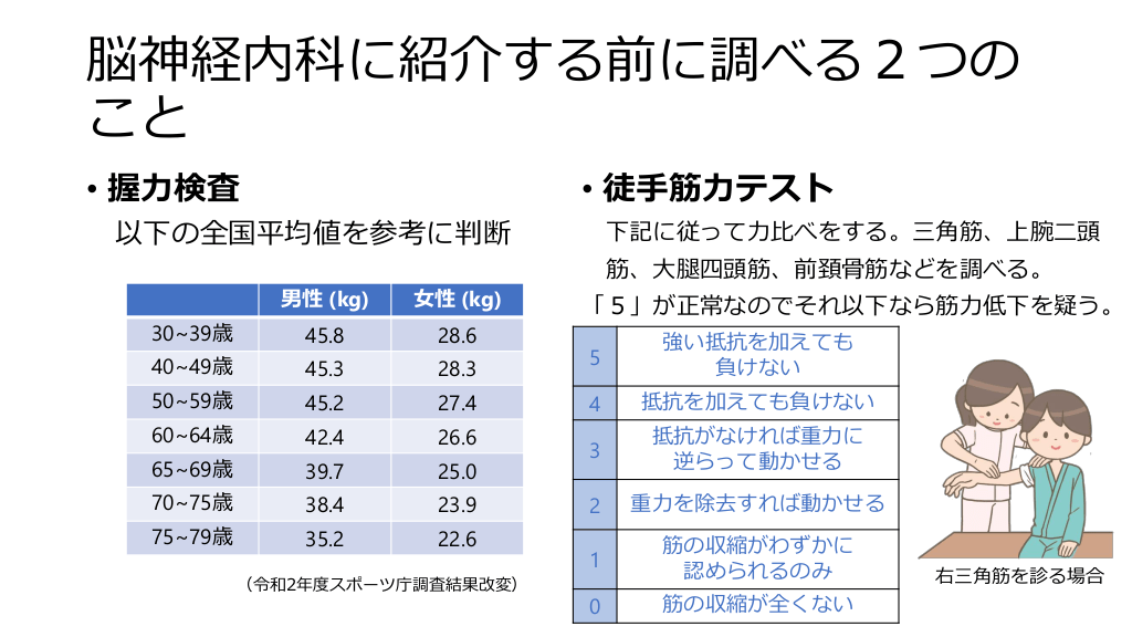 #9. 脳神経内科に紹介する前に調べる2つの こと • 握力検査 • 徒手筋力テスト 以下の全国平均値を参考に判断 下記に従って力比べをする。三角筋、上腕二頭 筋、大腿四頭筋、前頚骨筋などを調べる。 男性 (kg) 女性 (kg) 30~39歳 45.8 28.6 40~49歳 45.3 28.3 50~59歳 45.2 27.4 60~64歳 42.4 26.6 65~69歳 39.7 25.0 70~75歳 38.4 23.9 75~79歳 35.2 22.6 (令和2年度スポーツ庁調査結果改変) 「5」が正常なのでそれ以下なら筋力低下を疑う。 5 強い抵抗を加えても 負けない 4 抵抗を加えても負けない 3 抵抗がなければ重力に 逆らって動かせる 2 重力を除去すれば動かせる 1 筋の収縮がわずかに 認められるのみ 0 筋の収縮が全くない 右三角筋を診る場合