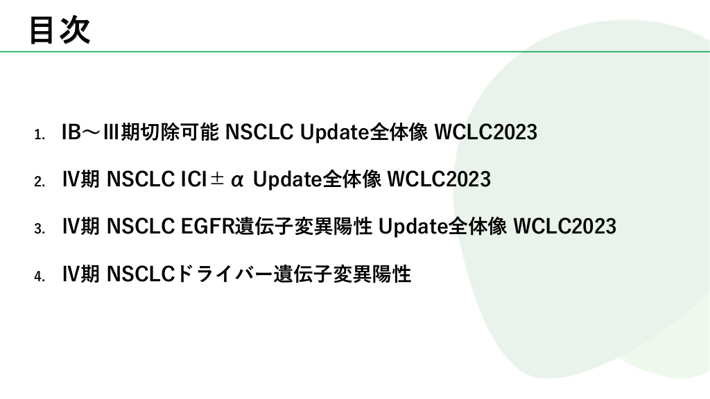 本スライドでは、世界肺がん学会(WCLC2023)で取り上げられた、肺がん治療に関する主なアップデートをまとめました。