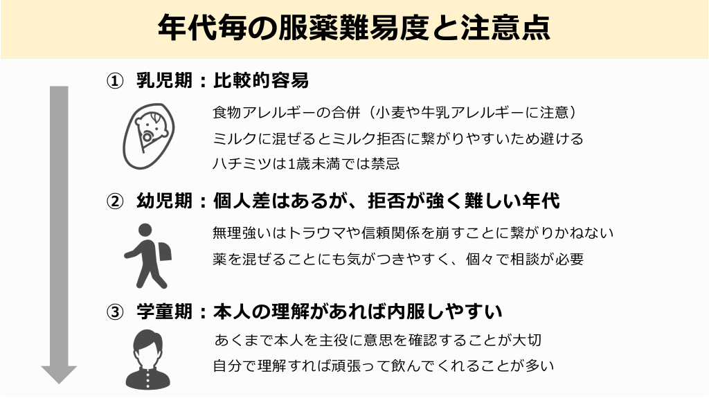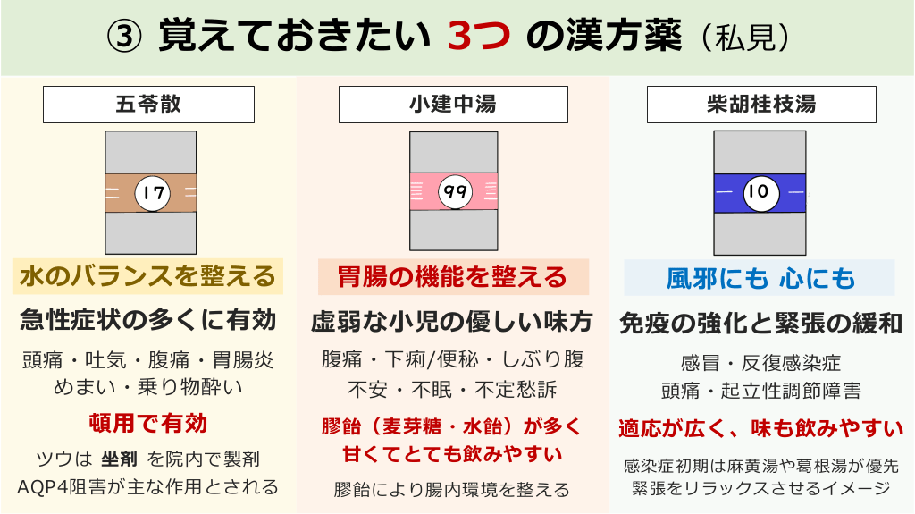 年代毎の服薬難易度と注意点 ① 乳児期︓⽐較的容易 ⾷物アレルギーの合併(⼩⻨や⽜乳アレルギーに注意) ミルクに混ぜるとミルク拒否に繋がりやすいため避ける ハチミツは1歳未満では禁忌 ② 幼児期︓個⼈差はあるが、拒否が強く難しい年代 無理強いはトラウマや信頼関係を崩すことに繋がりかねない 薬を混ぜることにも気がつきやすく、個々で相談が必要 ③ 学童期︓本⼈の理解があれば内服しやすい あくまで本⼈を主役に意思を確認することが⼤切 ⾃分で理解すれば頑張って飲んでくれることが多い 覚えておきたい3つの漢方薬 #11.