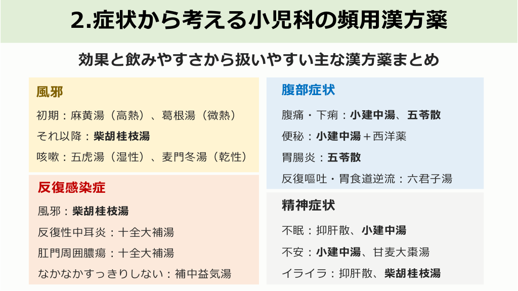 2.症状から考える⼩児科の頻⽤漢⽅薬 効果と飲みやすさから扱いやすい主な漢⽅薬まとめ ⾵邪 腹部症状 初期︓⿇⻩湯(⾼熱)、葛根湯(微熱) 腹痛・下痢︓⼩建中湯、五苓散 それ以降︓柴胡桂枝湯 便秘︓⼩建中湯+⻄洋薬 咳嗽︓五⻁湯(湿性)、⻨⾨冬湯(乾性) 胃腸炎︓五苓散 反復感染症 反復嘔吐・胃⾷道逆流︓六君⼦湯 ⾵邪︓柴胡桂枝湯 精神症状 反復性中⽿炎︓⼗全⼤補湯 不眠︓抑肝散、⼩建中湯 肛⾨周囲膿瘍︓⼗全⼤補湯 不安︓⼩建中湯、⽢⻨⼤棗湯 なかなかすっきりしない︓補中益気湯 イライラ︓抑肝散、柴胡桂枝湯 症状別の小児科頻用漢方薬のまとめ #13.