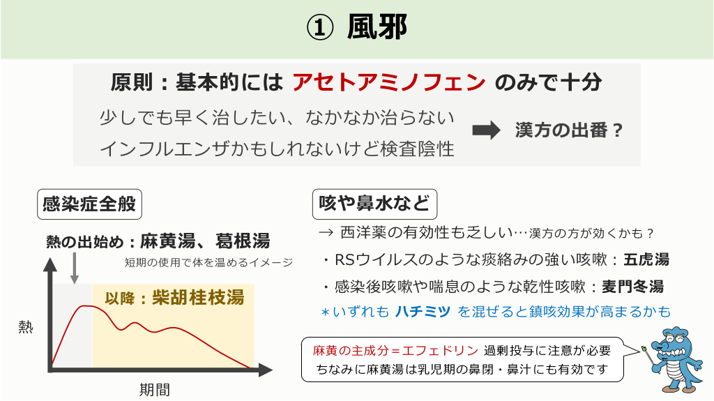 ① ⾵邪 原則︓基本的には アセトアミノフェン のみで⼗分 少しでも早く治したい、なかなか治らない インフルエンザかもしれないけど検査陰性 漢⽅の出番︖ 感染症全般 咳や⿐⽔など 熱の出始め︓ ⿇⻩湯、葛根湯 → ⻄洋薬の有効性も乏しい… 漢⽅の⽅が効くかも︖ 短期の使⽤で体を温めるイメージ 以降︓ 柴胡桂枝湯 熱 ・RSウイルスのような痰絡みの強い咳嗽︓五⻁湯 ・感染後咳嗽や喘息のような乾性咳嗽︓⻨⾨冬湯 *いずれも ハチミツ を混ぜると鎮咳効果が⾼まるかも ⿇⻩の主成分=エフェドリン 過剰投与に注意が必要 ちなみに⿇⻩湯は乳児期の⿐閉・⿐汁にも有効です 期間 #14.