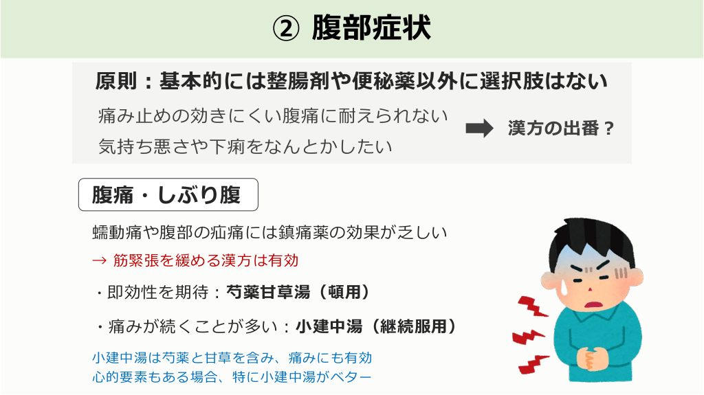 ② 腹部症状 原則︓基本的には整腸剤や便秘薬以外に選択肢はない 痛み⽌めの効きにくい腹痛に耐えられない 気持ち悪さや下痢をなんとかしたい 腹痛・しぶり腹 蠕動痛や腹部の疝痛には鎮痛薬の効果が乏しい → 筋緊張を緩める漢⽅は有効 ・ 即効性を期待︓芍薬⽢草湯(頓⽤) ・痛みが続くことが多い︓⼩建中湯(継続服⽤) ⼩建中湯は芍薬と⽢草を含み、痛みにも有効 ⼼的要素もある場合、特に⼩建中湯がベター 漢⽅の出番︖ #15.