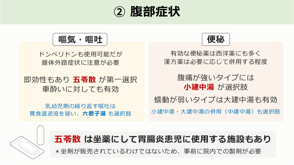 ② 腹部症状 嘔気・嘔吐 便秘 ドンペリドンも使⽤可能だが 錐体外路症状に注意が必要 有効な便秘薬は⻄洋薬にも多く 漢⽅薬は必要に応じて併⽤する程度 即効性もあり 五苓散 が第⼀選択 ⾞酔いに対しても有効 腹痛が強いタイプには ⼩建中湯 が選択肢 乳幼児期の繰り返す嘔吐は 胃⾷道逆流を疑い、六君⼦湯 も選択肢 蠕動が弱いタイプは⼤建中湯も有効 ⼩建中湯・⼤建中湯の併⽤(中建中湯)も選択肢 五苓散 は坐薬にして胃腸炎患児に使⽤する施設もあり *坐剤が販売されているわけではないため、事前に院内での製剤が必要 反復感染症と精神的な症状への漢方薬 #16.
