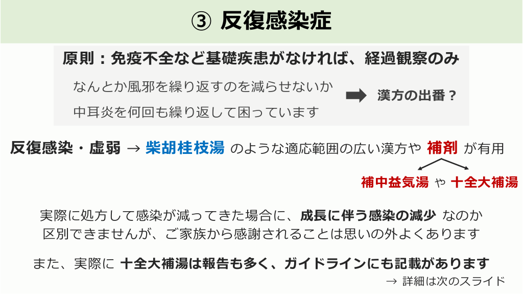③ 反復感染症 原則︓免疫不全など基礎疾患がなければ、経過観察のみ なんとか⾵邪を繰り返すのを減らせないか 中⽿炎を何回も繰り返して困っています 漢⽅の出番︖ 反復感染・虚弱 → 柴胡桂枝湯 のような適応範囲の広い漢⽅や 補剤 が有⽤ 補中益気湯 や ⼗全⼤補湯 実際に処⽅して感染が減ってきた場合に、成⻑に伴う感染の減少 なのか 区別できませんが、ご家族から感謝されることは思いの外よくあります また、実際に ⼗全⼤補湯は報告も多く、ガイドラインにも記載があります → 詳細は次のスライド #17.