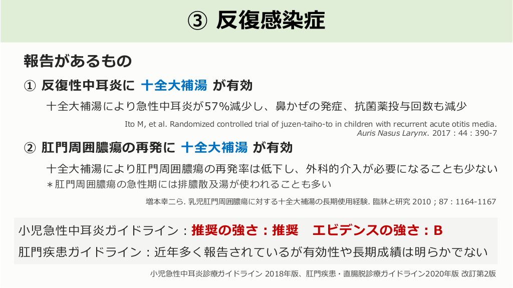 ③ 反復感染症 報告があるもの ① 反復性中⽿炎に ⼗全⼤補湯 が有効 ⼗全⼤補湯により急性中⽿炎が57%減少し、⿐かぜの発症、抗菌薬投与回数も減少 Ito M, et al. Randomized controlled trial of juzen-taiho-to in children with recurrent acute otitis media. Auris Nasus Larynx. 2017︓44︓390-7 ② 肛⾨周囲膿瘍の再発に ⼗全⼤補湯 が有効 ⼗全⼤補湯により肛⾨周囲膿瘍の再発率は低下し、外科的介⼊が必要になることも少ない *肛⾨周囲膿瘍の急性期には排膿散及湯が使われることも多い 増本幸⼆ら. 乳児肛⾨周囲膿瘍に対する⼗全⼤補湯の⻑期使⽤経験. 臨牀と研究 2010︔87︓1164-1167 ⼩児急性中⽿炎ガイドライン︓ 推奨の強さ︓推奨 エビデンスの強さ︓B 肛⾨疾患ガイドライン︓近年多く報告されているが有効性や⻑期成績は明らかでない ⼩児急性中⽿炎診療ガイドライン 2018年版、肛⾨疾患・直腸脱診療ガイドライン2020年版 改訂第2版 #18.