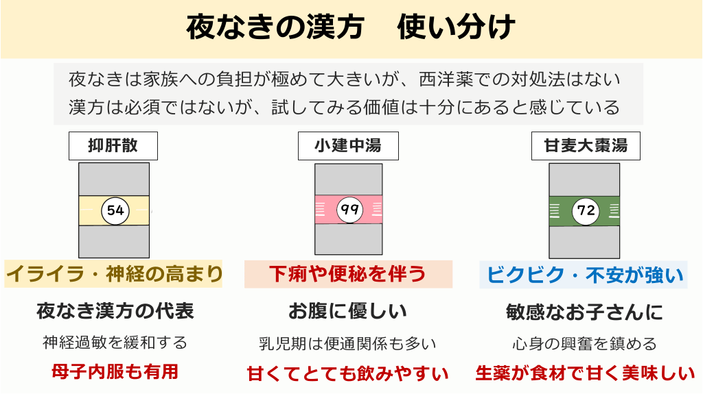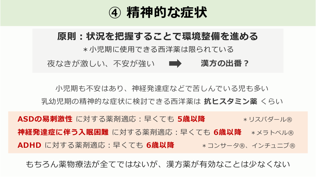 ④ 精神的な症状 原則︓状況を把握することで環境整備を進める *⼩児期に使⽤できる⻄洋薬は限られている 夜なきが激しい、不安が強い 漢⽅の出番︖ ⼩児期も不安はあり、神経発達症などで苦しんでいる児も多い 乳幼児期の精神的な症状に検討できる⻄洋薬は 抗ヒスタミン薬 くらい ASDの易刺激性 に対する薬剤適応︓早くても 5歳以降 神経発達症に伴う⼊眠困難 に対する薬剤適応︓早くても 6歳以降 ADHD に対する薬剤適応︓早くても 6歳以降 *リスパダール® *メラトベル® *コンサータ®、インチュニブ® もちろん薬物療法が全てではないが、漢⽅薬が有効なことは少なくない 夜泣きに対する漢方薬の使い分け #19.