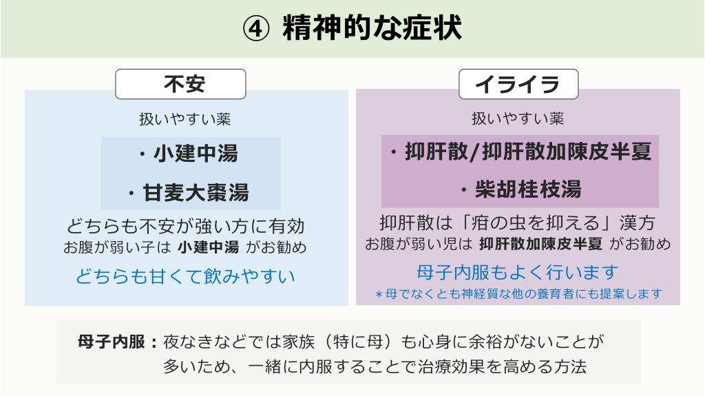 ④ 精神的な症状 不安 イライラ 扱いやすい薬 扱いやすい薬 ・⼩建中湯 ・抑肝散/抑肝散加陳⽪半夏 ・⽢⻨⼤棗湯 ・柴胡桂枝湯 どちらも不安が強い⽅に有効 抑肝散は「疳の⾍を抑える」漢⽅ お腹が弱い⼦は ⼩建中湯 がお勧め お腹が弱い児は 抑肝散加陳⽪半夏 がお勧め どちらも⽢くて飲みやすい ⺟⼦内服もよく⾏います *⺟でなくとも神経質な他の養育者にも提案します ⺟⼦内服︓夜なきなどでは家族(特に⺟)も⼼⾝に余裕がないことが 多いため、⼀緒に内服することで治療効果を⾼める⽅法 #20.