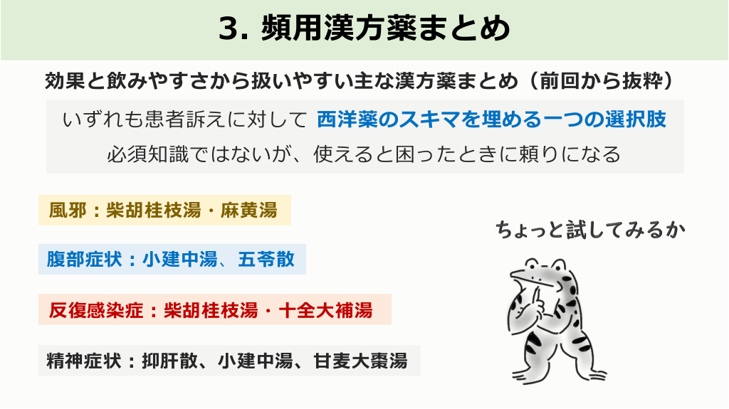3. 頻⽤漢⽅薬まとめ 効果と飲みやすさから扱いやすい主な漢⽅薬まとめ(前回から抜粋) いずれも患者訴えに対して ⻄洋薬のスキマを埋める⼀つの選択肢 必須知識ではないが、使えると困ったときに頼りになる ⾵邪︓柴胡桂枝湯・⿇⻩湯 腹部症状︓⼩建中湯、五苓散 反復感染症︓柴胡桂枝湯・⼗全⼤補湯 精神症状︓抑肝散、⼩建中湯、⽢⻨⼤棗湯 #22.