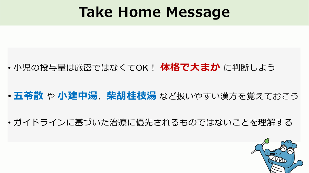 ⼩児科で使⽤する漢⽅薬のポイント • ⻑引く症状や不定愁訴に対して処⽅を考えやすい • 年齢制限などで⻄洋薬が使いにくい 精神症状 に処⽅が可能 • 最⼤の障壁はもちろん 味と臭い • ⼗分な 服薬指導 と 本⼈・保護者のやる気 が⼤切 • 各種ガイドラインに基づいた治療に優先されるものではない 悩める⼩児に対する使いやすい武器の⼀つ ご家族の希望もある場合は特に扱いやすい選択肢 #4.