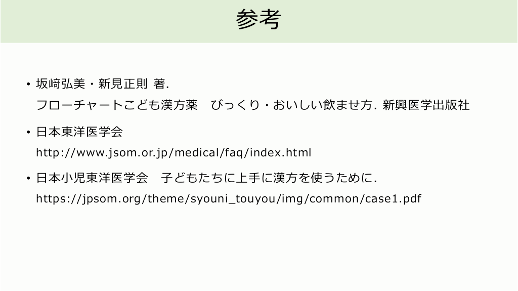 Take Home Message • ⼩児の投与量は厳密ではなくてOK︕ 体格で⼤まか に判断しよう • 五苓散 や ⼩建中湯 、 柴胡桂枝湯 など扱いやすい漢⽅を覚えておこう • ガイドラインに基づいた治療に優先されるものではないことを理解する 参考文献と関連情報 #23. 参考 • 坂﨑弘美・新⾒正則 著. フローチャートこども漢⽅薬 びっくり・おいしい飲ませ⽅. 新興医学出版社 • ⽇本東洋医学会 http://www.jsom.or.jp /medical /faq /index.html • ⽇本⼩児東洋医学会 ⼦どもたちに上⼿に漢⽅を使うために. https://jpsom.org /theme /syouni_touyou /img /common /case1.pdf