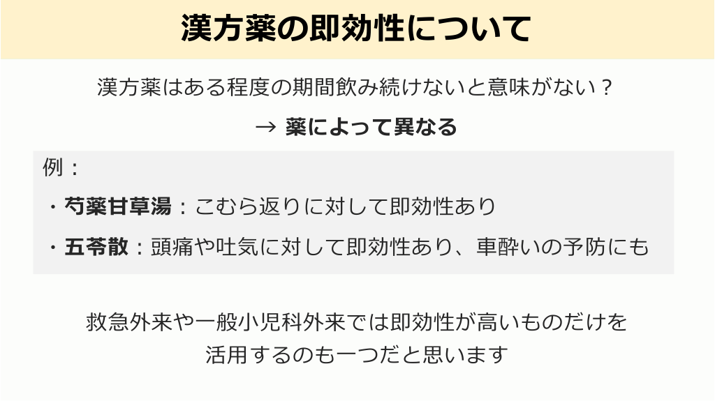漢⽅薬の即効性について 漢⽅薬はある程度の期間飲み続けないと意味がない︖ → 薬によって異なる 例︓ ・芍薬⽢草湯︓こむら返りに対して即効性あり ・五苓散︓頭痛や吐気に対して即効性あり、⾞酔いの予防にも 救急外来や⼀般⼩児科外来では即効性が⾼いものだけを 活⽤するのも⼀つだと思います #5.
