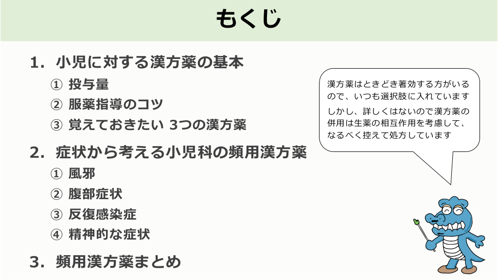 もくじ 1. ⼩児に対する漢⽅薬の基本 ① 投与量 ② 服薬指導のコツ ③ 覚えておきたい 3つの漢⽅薬 2. 症状から考える⼩児科の頻⽤漢⽅薬 ① ⾵邪 ② 腹部症状 ③ 反復感染症 ④ 精神的な症状 3. 頻⽤漢⽅薬まとめ 漢⽅薬はときどき著効する⽅がいる ので、いつも選択肢に⼊れています しかし、詳しくはないので漢⽅薬の 併⽤は⽣薬の相互作⽤を考慮して、 なるべく控えて処⽅しています 漢方薬の投与量と服薬指導のコツ #6.