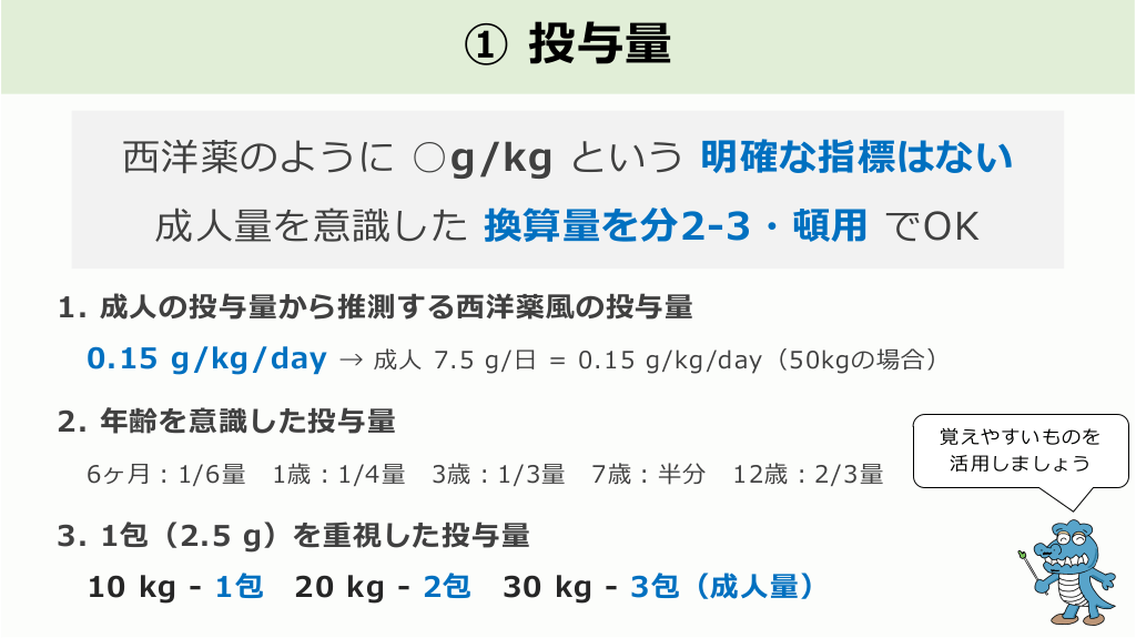 ① 投与量 ⻄洋薬のように ○g /kg という 明確な指標はない 成⼈量を意識した 換算量を分2-3・頓⽤ でOK 1. 成⼈の投与量から推測する⻄洋薬⾵の投与量 0.15 g /kg /day → 成⼈ 7.5 g /⽇ = 0.15 g /kg /day(50kgの場合) 2. 年齢を意識した投与量 6ヶ⽉︓1/6量 1歳︓1/4量 3歳︓1/3量 7歳︓半分 12歳︓2/3量 3. 1包(2.5 g)を重視した投与量 10 kg - 1包 20 kg - 2包 30 kg - 3包(成⼈量) 覚えやすいものを 活⽤しましょう #7.