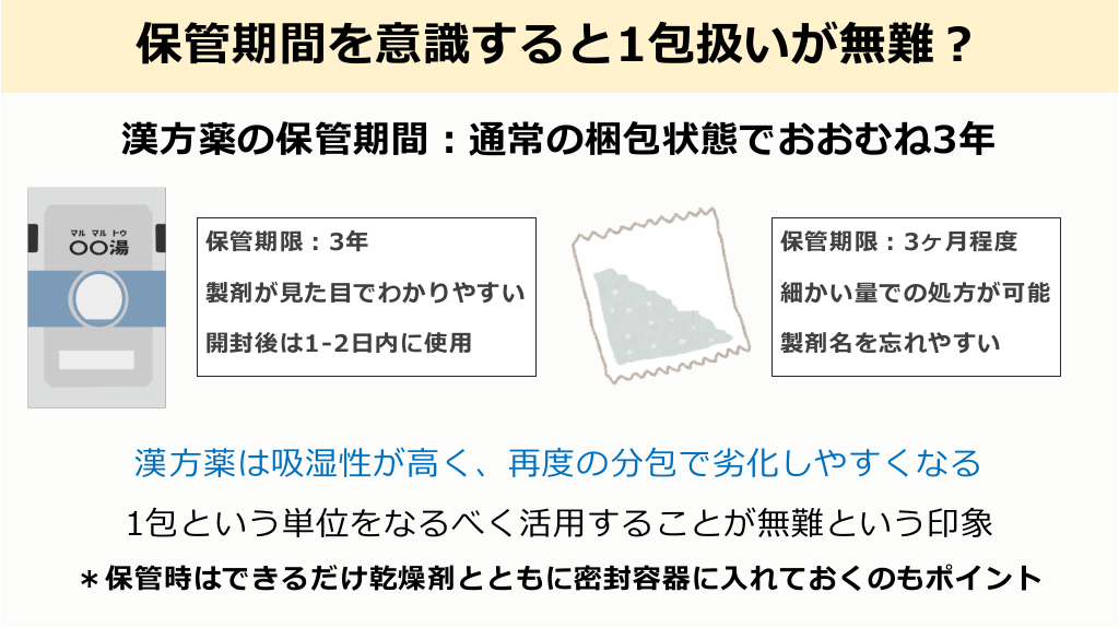 保管期間を意識すると1包扱いが無難︖ 漢⽅薬の保管期間︓通常の梱包状態でおおむね3年 保管期限︓3年 保管期限︓3ヶ⽉程度 製剤が⾒た⽬でわかりやすい 細かい量での処⽅が可能 開封後は1-2⽇内に使⽤ 製剤名を忘れやすい 漢⽅薬は吸湿性が⾼く、再度の分包で劣化しやすくなる 1包という単位をなるべく活⽤することが無難という印象 *保管時はできるだけ乾燥剤とともに密封容器に⼊れておくのもポイント #8.