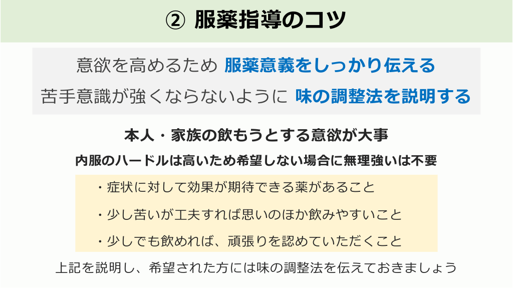 ② 服薬指導のコツ 意欲を⾼めるため 服薬意義をしっかり伝える 苦⼿意識が強くならないように 味の調整法を説明する 本⼈・家族の飲もうとする意欲が⼤事 内服のハードルは⾼いため希望しない場合に無理強いは不要 ・症状に対して効果が期待できる薬があること ・少し苦いが⼯夫すれば思いのほか飲みやすいこと ・少しでも飲めれば、頑張りを認めていただくこと 上記を説明し、希望された⽅には味の調整法を伝えておきましょう 年代別の服薬難易度と注意点 #9.