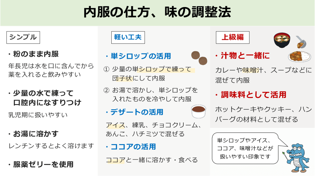 内服の仕⽅、味の調整法 シンプル ・粉のまま内服 年⻑児は⽔を⼝に含んでから 薬を⼊れると飲みやすい ・少量の⽔で練って ⼝腔内になすりつけ 乳児期に扱いやすい ・お湯に溶かす レンチンするとよく溶けます ・服薬ゼリーを使⽤ 軽い⼯夫 ・単シロップの活⽤ ① 少量の単シロップで練って 団⼦状にして内服 ② お湯で溶かし、単シロップを ⼊れたものを冷やして内服 ・デザートの活⽤ アイス、練乳、チョコクリーム、 あんこ、ハチミツで混ぜる ・ココアの活⽤ ココアと⼀緒に溶かす・⾷べる 上級編 ・汁物と⼀緒に カレーや味噌汁、スープなどに 混ぜて内服 ・調味料として活⽤ ホットケーキやクッキー、ハン バーグの材料として混ぜる 単シロップやアイス、 ココア、味噌汁などが 扱いやすい印象です #10.