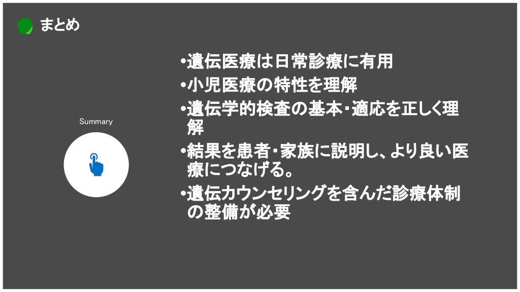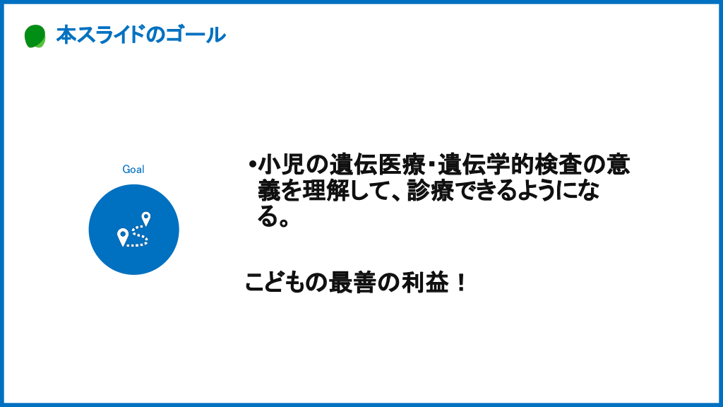 小児の遺伝医療・遺伝学的検査の意義を理解して、診療できるようになることをゴールに、遺伝医療や診断・遺伝学的検査、遺伝カウンセリングについてスライドにまとめました。