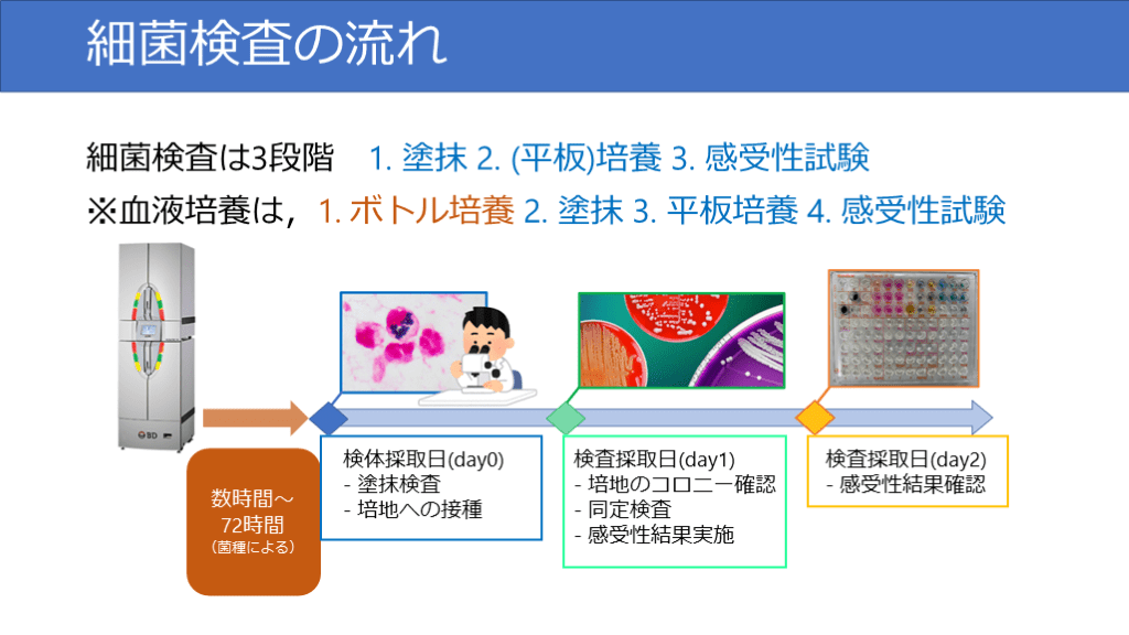 #5. 細菌検査の流れ 細菌検査は3段階 1. 塗抹 2. (平板)培養 3. 感受性試験※血液培養は,1. ボトル培養 2. 塗抹 3. 平板培養 4. 感受性試験 数時間〜72時間(菌種による) 検体採取日(day0)- 塗抹検査- 培地への接種 検査採取日(day1)- 培地のコロニー確認- 同定検査- 感受性結果実施 検査採取日(day2)- 感受性結果確認