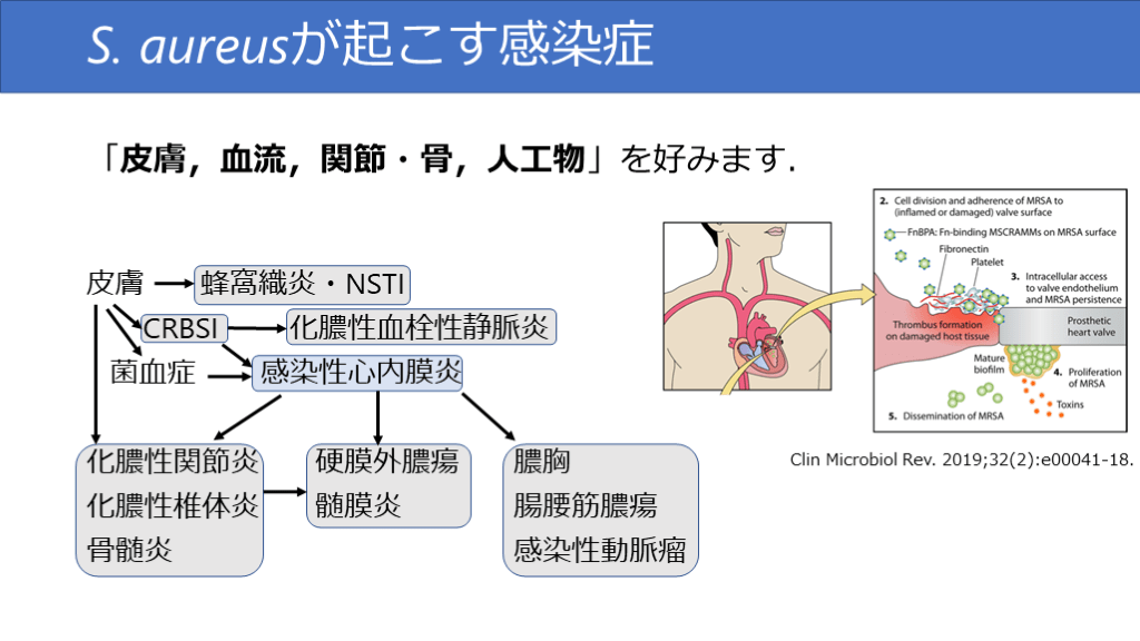 皮膚 蜂窩織炎・NSTI CRBSI 化膿性血栓性静脈炎 菌血症 感染性心内膜炎化膿性関節炎 硬膜外膿瘍 膿胸化膿性椎体炎 髄膜炎 腸腰筋膿瘍骨髄炎 感染性動脈瘤 S. aureusが起こす感染症 Clin Microbiol Rev. 2019;32(2):e00041-18.