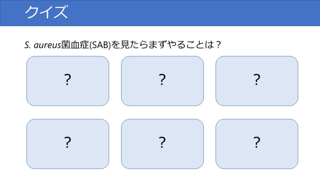 #8. クイズ S. aureus菌血症(SAB)を見たらまずやることは? ? ? ? ? ? ?