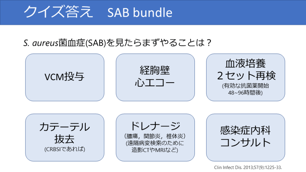 #9. クイズ答え SAB bundle S. aureus菌血症(SAB)を見たらまずやることは? 血液培養2セット再検(有効な抗菌薬開始48~96時間後) 経胸壁心エコー VCM投与 カテーテル抜去(CRBSIであれば) ドレナージ(膿瘍,関節炎,椎体炎)(遠隔病変検索のために造影CTやMRIなど) 感染症内科コンサルト Clin Infect Dis. 2013;57(9):1225-33.