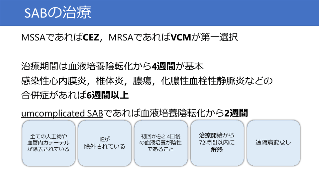 #10. SABの治療 MSSAであればCEZ,MRSAであればVCMが第一選択治療期間は血液培養陰転化から4週間が基本感染性心内膜炎,椎体炎,膿瘍,化膿性血栓性静脈炎などの合併症があれば6週間以上