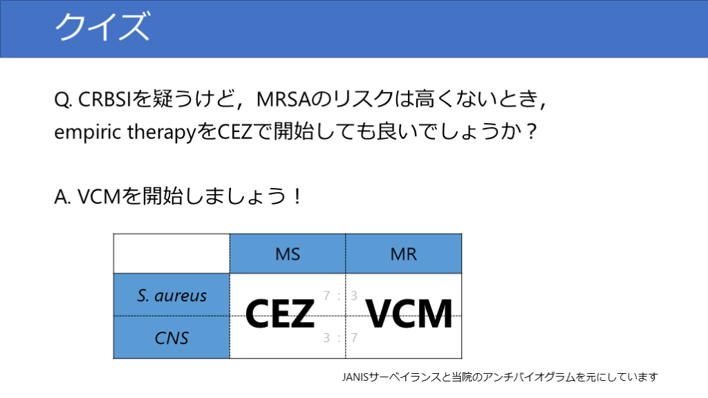 #13. クイズ Q. CRBSIを疑うけど,MRSAのリスクは高くないとき,empiric therapyをCEZで開始しても良いでしょうか?A. VCMを開始しましょう! CEZ VCM JANISサーベイランスと当院のアンチバイオグラムを元にしています