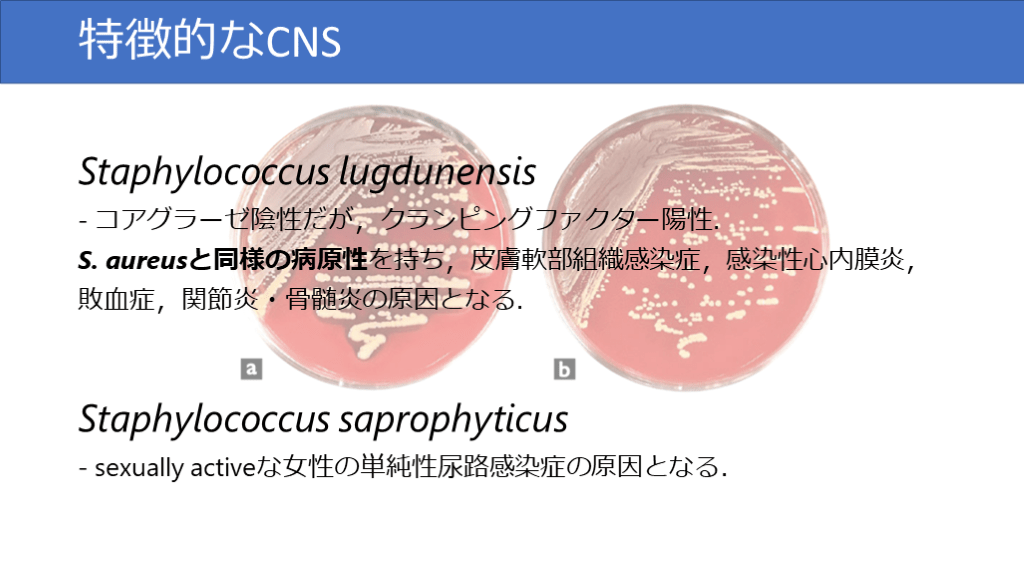 #14. 特徴的なCNS Staphylococcus lugdunensis- コアグラーゼ陰性だが,クランピングファクター陽性.S. aureusと同様の病原性を持ち,皮膚軟部組織感染症,感染性心内膜炎,敗血症,関節炎・骨髄炎の原因となる.