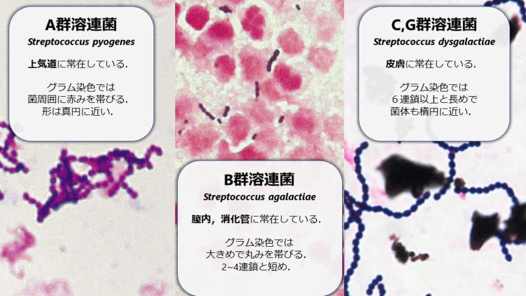 Streptococcus agalactiae膣内,消化管に常在している.グラム染色では大きめで丸みを帯びる.2~4連鎖と短め. C,G群溶連菌