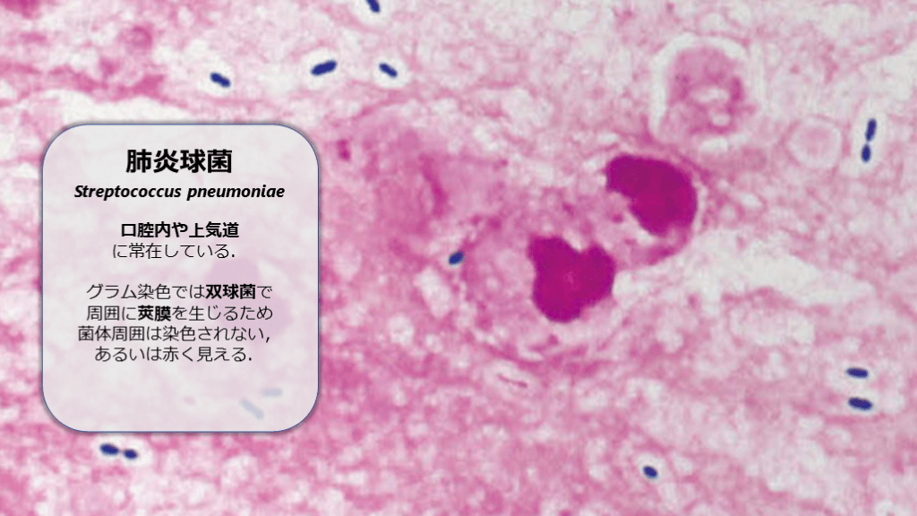 #17. 肺炎球菌Streptococcus pneumoniae口腔内や上気道に常在している.グラム染色では双球菌で周囲に莢膜を生じるため菌体周囲は染色されない,あるいは赤く見える.