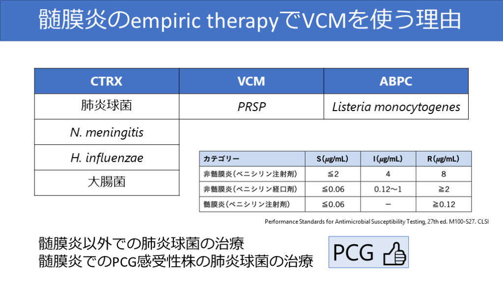 #19. 髄膜炎のempiric therapyでVCMを使う理由 髄膜炎以外での肺炎球菌の治療髄膜炎でのPCG感受性株の肺炎球菌の治療 Performance Standards for Antimicrobial Susceptibility Testing, 27th ed. M100-S27. CLSI PCG 👍