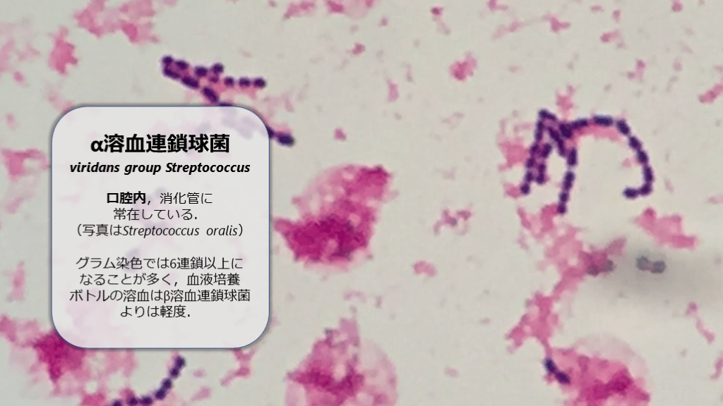 (写真はStreptococcus oralis)グラム染色では6連鎖以上になることが多く,血液培養ボトルの溶血はβ溶血連鎖球菌よりは軽度.