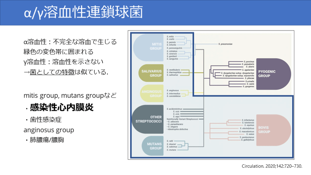mitis group, mutans groupなど・感染性心内膜炎・歯性感染症anginosus group・肺膿瘍/膿胸 Circulation. 2020;142:720–730.