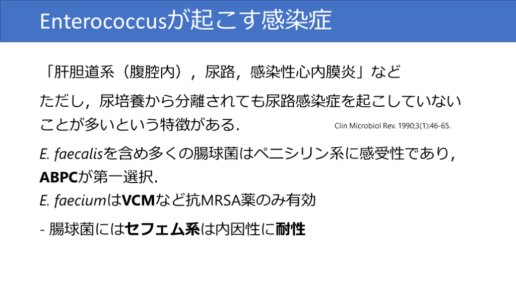E. faecalisを含め多くの腸球菌はペニシリン系に感受性であり,ABPCが第一選択.E. faeciumはVCMなど抗MRSA薬のみ有効