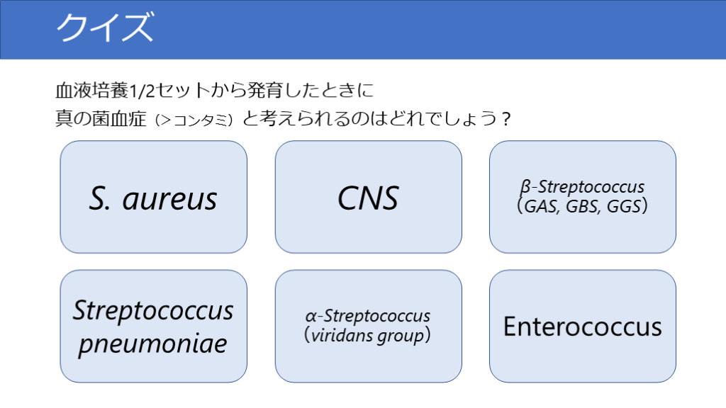 #26. クイズ 血液培養1/2セットから発育したときに真の菌血症(>コンタミ)と考えられるのはどれでしょう? S. aureus CNS β-Streptococcus(GAS, GBS, GGS) Streptococcus pneumoniae α-Streptococcus(viridans group) Enterococcus
