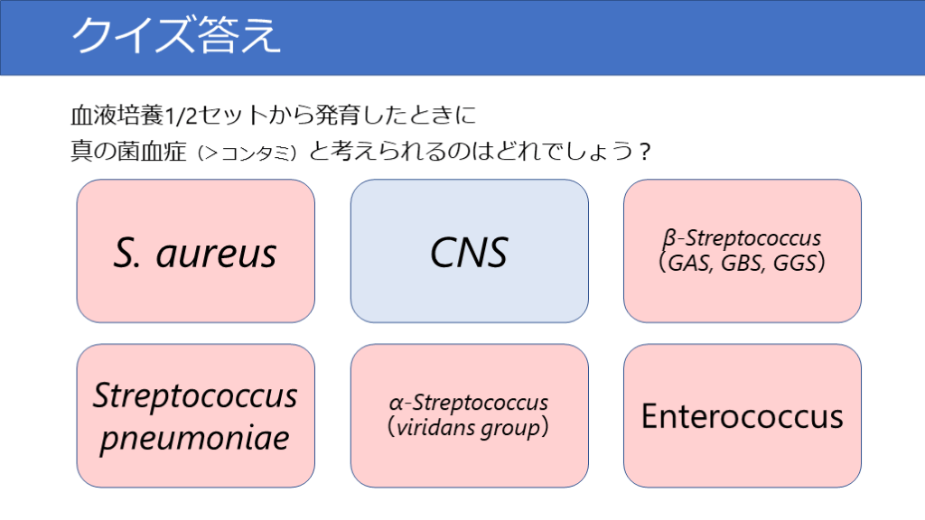 #27. クイズ答え 血液培養1/2セットから発育したときに真の菌血症(>コンタミ)と考えられるのはどれでしょう? S. aureus CNS β-Streptococcus(GAS, GBS, GGS) Streptococcus pneumoniae α-Streptococcus(viridans group) Enterococcus