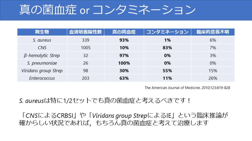 #28. 真の菌血症 or コンタミネーション The American Journal of Medicine. 2010;123:819-828 S. aureusは特に1/2セットでも真の菌血症と考えるべきです!