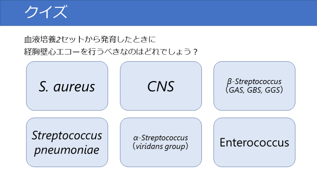 #29. クイズ 血液培養2セットから発育したときに経胸壁心エコーを行うべきなのはどれでしょう? S. aureus CNS β-Streptococcus(GAS, GBS, GGS) Streptococcus pneumoniae α-Streptococcus(viridans group) Enterococcus