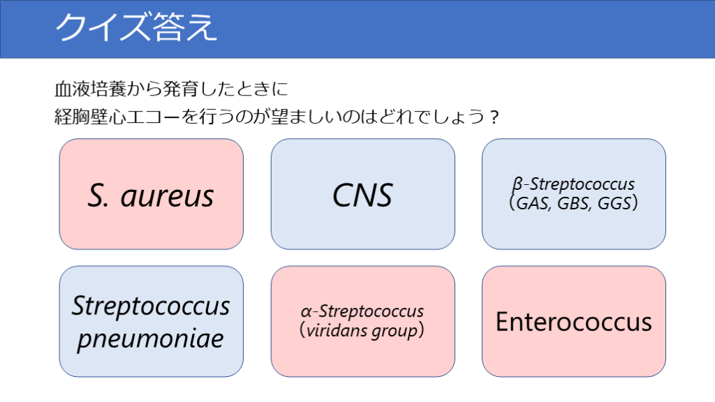 #30. クイズ答え 血液培養から発育したときに経胸壁心エコーを行うのが望ましいのはどれでしょう? S. aureus CNS β-Streptococcus(GAS, GBS, GGS) Streptococcus pneumoniae α-Streptococcus(viridans group) Enterococcus