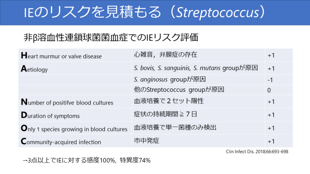 #34. IEのリスクを見積もる(Streptococcus) 非β溶血性連鎖球菌菌血症でのIEリスク評価 Clin Infect Dis. 2018;66:693-698 →3点以上でIEに対する感度100%, 特異度74%