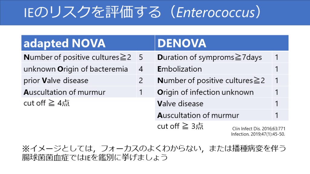 #35. IEのリスクを評価する(Enterococcus) Clin Infect Dis. 2016;63:771Infection. 2019;47(1):45-50. ※イメージとしては,フォーカスのよくわからない,または播種病変を伴う腸球菌菌血症ではIEを鑑別に挙げましょう