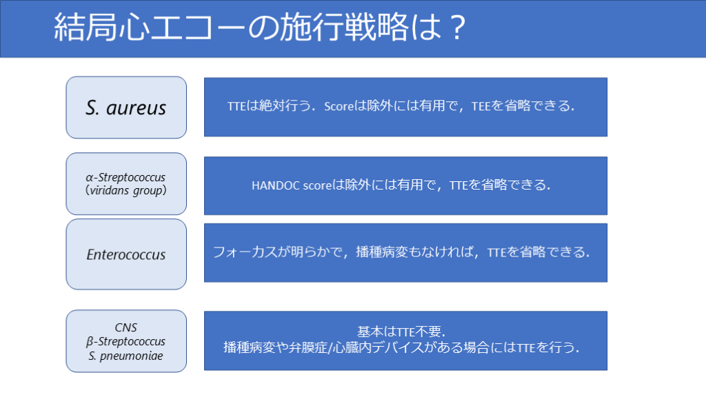 #36. 結局心エコーの施行戦略は? S. aureus α-Streptococcus(viridans group) CNSβ-StreptococcusS. pneumoniae Enterococcus TTEは絶対行う.Scoreは除外には有用で,TEEを省略できる. HANDOC scoreは除外には有用で,TTEを省略できる. フォーカスが明らかで,播種病変もなければ,TTEを省略できる. 基本はTTE不要.播種病変や弁膜症/心臓内デバイスがある場合にはTTEを行う.