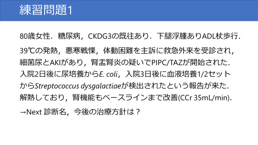 39℃の発熱,悪寒戦慄,体動困難を主訴に救急外来を受診され,細菌尿とAKIがあり,腎盂腎炎の疑いでPIPC/TAZが開始された.入院2日後に尿培養からE. coli,入院3日後に血液培養1/2セットからStreptococcus dysgalactiaeが検出されたという報告が来た.解熱しており,腎機能もベースラインまで改善(CCr 35mL/min).
