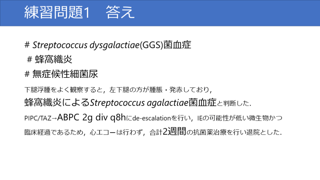 #38. 練習問題1 答え # Streptococcus dysgalactiae(GGS)菌血症 # 蜂窩織炎# 無症候性細菌尿